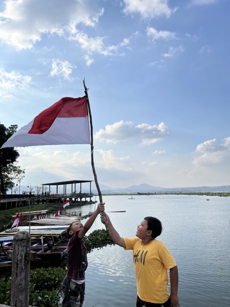 Potret pengibaran bendera merah putih yang dilakukan anak-anak setempat.